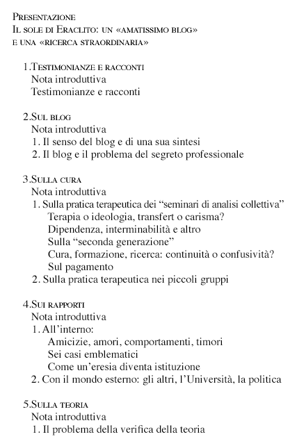 Il primo capitolo, Testimonianze e racconti, raccoglie le comunicazioni che più direttamente denunciano aspetti problematici della pratica clinica ed extraclinica dell'esperienza in questione. I post di questa sezione sono numerati poiché è soprattutto ad alcuni di essi che ci si riferirà nel progredire della discussione. Nel secondo capitolo, Sul blog, sono contenuti i messaggi relativi alla stessa legittimità del blog, in un confronto tra suoi sostenitori e suoi detrattori. In esso vengono sollevate questioni di deontologia e di opportunità che per essere meglio comprese sono precedute da una premessa centrata sul rapporto, negli anni, dell'analisi collettiva con i media. La questione dell'autoreferenzialità, propria di una realtà isolata, risulta in tal modo svelata in molti dei suoi meccanismi e delle sue dinamiche, comuni a situazioni analoghe, anche se apparentemente distanti.