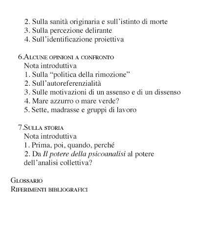 Il quinto capitolo, Sulla teoria, tratta delle ipotesi teoriche di Fagioli (l'introduzione riassume le principali novità del suo pensiero, dando modo al lettore di orientarsi). Mentre il riferimento alla teoria è una costante dell'esperienza in analisi collettiva, nel blog questi temi sono più che altro accennati, inizi di una riflessione ancora da svolgere. Il sesto capitolo (introdotto solo da poche righe), Opinioni a confronto, è composto di post quasi tutti firmati da addetti ai lavori che hanno conosciuto da vicino quell'esperienza. In esso i riferimenti al mondo e ai temi della psicoterapia sono costanti e ampi. Il settimo e ultimo capitolo, Sulla storia - dopo una suggestiva introduzione che spiega il titolo del volume (tratto da Il Mago di Oz) e colloca storicamente il blog e l'esperienza che lo ha originato - si interroga sulla vicenda complessiva di quest'esperienza, in particolare su un suo «prima» e un suo «poi» che ne spieghino l'attuale distanza da essa degli autori.