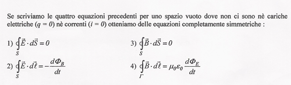 Anche nel caso delle equazioni di Maxwell, l'asimmetria delle equazioni ha origine nella traslazione dal simbolo al segno. Matematicamente vuol dire riscrivere le equazioni considerando LO SPAZIO VUOTO dove non siano presenti né correnti (ì=0) né cariche elettriche (q=0), così otteniamo le equazioni completamente SIMMETRICHE. In questo caso, se consideriamo lo SPAZIO VUOTO, questa visione dello SPAZIO è coerente con L'ANOMALIA ORIGINARIA e nello stesso tempo con la struttura SIMMETRICO-SIMBOLICA. IL PRIMO PASSO LOGICO é LA NON ASSUNZIONE DEL CONCETTO "SIMMETRICO" COME BASE DI PARTENZA DELLA STRUTTURA MATEMATICA EVITANDO LA COINCIDENZA DI QUEST'ULTIMA CON LA "REALT "FISICO-TEORICA" E CON LA REALTÀ "NATURALE". DA QUESTO PUNTO DI VISTA IL PROBLEMA DELLA "ROTTURA" SPONTANEA DELLA SIMMETRIA E' UN FALSO PROBLEMA*: IL VERO PROBLEMA RIMANE LA DISFUNZIONE PERCETTIVA CONGENITA, CHE SI CONCRETIZZA ATTRAVERSO LA CATEGORIA "TRASCENDENTALE" DEL SIMMETRICO (Per dirla con il Kant della Ragion pura).