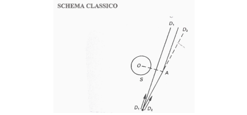 If there were not the Sun (S), a star at an infinite distance should be seen in direction D1 if watched from the Earth. Though, as a consequence of the deflection of the light coming from the star caused by the Sun, the star will be seen in direction D2, that is at a distance from the centre of the Sun a little higher than its real position. (La Scienza, UTET).