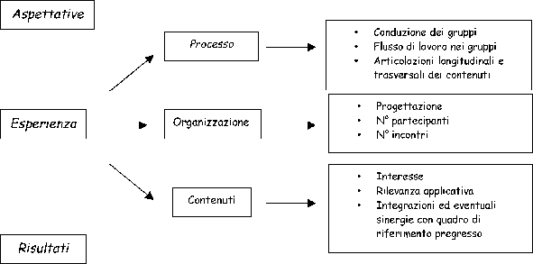 Lo studio dei risultati è stato effettuato evidenziando per ogni area dindagine presa in considerazione dagli strumenti (aspettative, processo, organizzazione e risultati) le tematiche emerse e mettendo a confronto trasversalmente quelle individuate nei protocolli delle interviste con quelle individuate nel protocollo del focus group (vedi tab.2). Ciò ha permesso di ricostruire il percorso compiuto dai gruppi prendendo in considerazione le diverse chiavi di lettura e integrando apporti delluna con apporti dellaltra parte.