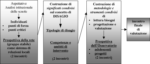 Gli incontri, indirizzati ad insegnanti referenti per la salute o funzione obiettivo (soprattutto di area 3) sono stati organizzati per moduli. Il seguente diagramma evidenzia il percorso seguito.