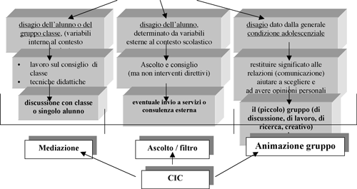 In relazione alle tipologie di disagio rilevato, le competenze del CIC si suddividono in me-diazione, ascolto/filtro verso i servizi, animazione del piccolo gruppo di alunni nella scuola. I primi due interventi sono di prevenzione secondaria in quanto si attuano su situazioni di disagio già conclamato; il terzo tipo di intervento (lanimazione del gruppo) è di prevenzione primaria in quanto coinvolge tutti gli adolescenti, per contenere levoluzione di possibili fattori di rischio per la salute.