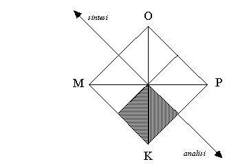 Questa figura differisce rispetto a quella riportata precedentemente (cap.II) perché è stato aggiunto l’asse sintetico-analitico, che l’attraversa obliquamente. Ora il campo è orientato: da una parte i vertici a prevalenza sintetica (M e O), dall’altra i vertici a prevalenza analitica (P e K). Il campo risulta diviso in quattro quadranti, uno per vertice, e ciascuno di questi è diviso a sua volta in due parti, corrispondenti ai versanti sintetico e analitico di ogni vertice. I due versanti del vertice K, che nella figura appaiono evidenziati, confinano con i quadranti dei vertici M e P: ottiene così evidenza grafica il fatto che le operazioni di vertice cognitivo sfumano da un lato e dall’altro verso quelle dei vertici parentali. Lo schema ha valore orientativo, ma è ovvio che il passaggio da un settore all’altro del campo non è segnato da una linea retta. Ogni atto terapeutico è un’operazione integrata, in cui i diversi vertici e la polarità analitico-sintetica si combinano nei modi più vari.