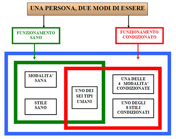 (t) “ Modelli interattivi dei funzionamenti relazionali ” [ Il principio base di questo modello interpretativo è che la persona possiede due modi di essere: quello sano e quello condizionato. Il termine condizionato è riferito ai condizionamenti negativi avuti durante l’infanzia. La persona è questi due tipi di atteggiamenti, questi due modi di porsi in relazione. Nella persona sana è prevalente il funzionamento sano, nella persona che vive il disagio è più o meno prevalente il funzionamento condizionato. Tale concezione è relazionale: la persona non è un elenco di bisogni o di esigenze, essa consiste in come si rapporta alle esigenze interne e a quelle esterne. Due tipi di funzionamento significa due qualità diverse di pensieri, di emozioni, di ricordi. Per esempio esistono due tipi di rabbia, quella sana per cui se uno ci pesta il piede gli si dà una gomitata e ce se ne libera e c’è la rabbia della persona che vive soprattutto la componente condizionata che se la porta dietro continuamente.