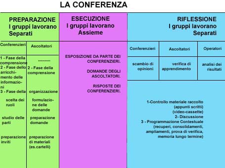il gruppo dei conferenzieri viene introdotto al racconto per primo. Il racconto e' stato precedentemente adattato alla performance media del gruppo. La fase della comprensione e' quella piu' importante ed anche la piu' lunga, essa ha come primo obiettivo l'assimilazione delle strutture spazio-temporali, dei legami di causalita' e la conoscenza degli aspetti essenziali del carattere dei personaggi. Quando si e' raggiunto il livello di comprensione suddetto, si puo' passare alla seconda fase. (Durante la prima fase il gruppo di ascoltatori non lavora ancora per la conferenza). 1.1.2 Seconda fase La seconda fase include l'ampliamento delle informazioni; questa fase e' particolarmante interessante perche' prevede il collegamento con le altre aree d'intervento della Scuoletta: area dell'osservazione dell'ambiente, area logico-matematica. Si verifica la possibilita' da parte dei ragazzi di riportare le proprie esperienze, di fare domande, di aprire discussioni, ecc. E' importante notare, per avere una visione globale, che, mentre il gruppo E (gruppo dei "Conferenzieri") lavora a questi livelli, ai gruppi C e D ("Ascoltatori") viene presentato separatamente per la prima volta il racconto come sempre adattato alle performances dei gruppi. 1.1.3 Terza fase In questa fase si diversifica ulteriormente il lavoro svolto dal gruppo dei conferenzieri e quello degli ascoltatori. I primi infatti cominciano la vera preparazione per la conferenza con la scelta dei ruoli, lo studio e la ripetizione delle parti, le prove ed infine la preparazione degli inviti. Il gruppo degli ascoltatori invece, una volta superata la fase della comprensione, non usurfruisce della fase dell'arricchimento delle informazioni, ma ha la possibilita' di formulare delle domande che vengono poi selezionate per essere presentate al momento della conferenza. Il fatto che il gruppo degli ascoltatori giunga alla conferenza senza avere goduto della fase dell'arricchimento delle informazioni, e' un elemento importante nella dinamica interna del lavoro, essa infatti prevede il costante mantenimento della differenza di competenze tra conferenzieri ed ascoltatori. Fino alla conclusione dell'esperienza i Conferenzieri rivestono quindi il ruolo di "esperti" dell'argomento trattato. 1.2 Momento dell'esecuzione Nel giorno e nell'ora stabilita (com'e' scritto nell'invito ideato e preparato dai ragazzi) viene effettuata la conferenza. Come abbiamo gia' detto questo e' dei tre momenti l'unico nel quale i gruppi s'incontrano direttamente. Le caratteristiche dell'incontro sono: (1) situazione strutturata (2) setting preciso (3) aspetto culturale 1.2.1 Lo spazio La stanza viene suddivisa in tre spazi ben distinti