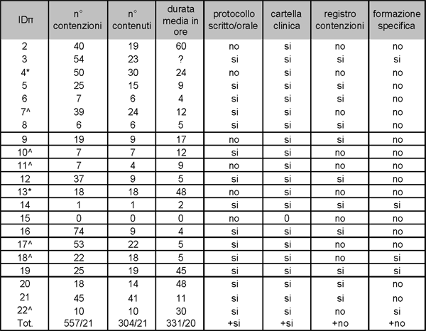Un registro contenzione (Tabella 1) è risultato in funzione , da alcuni anni, presso 11 SPDC. Su di esso, abitualmente, sono riportati i motivi che hanno determinato l'intervento di contenzione, le misure assistenziali disposte per la cura del paziente, l'orario di inizio e di fine contenzione. I SPDC sprovvisti di un registro delle contenzioni hanno ricavato i dati attraverso l'esame delle cartelle cliniche, o, nei casi in cui non è stato possibile consultare le cartelle cliniche, attraverso la dichiarazione del Responsabile del Reparto.