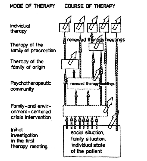 Quando gli incontri terapeutici divennero il punto di partenza delle nostre attività, come terreno acquisito del pensiero sistemico, il nostro team preparò un diagramma (figura 5.4) per rappresentare il peso dei metodi terapeutici a orientamento psicoterapeutico applicati nel corso del trattamento adattato al bisogno delle psicosi schizofreniche. Oltre alla schizofrenia, il diagramma può essere applicato anche alle altre psicosi funzionali incluse nello spettro della schizofrenia (specialmente psicosi paranoiche e disturbi psicotici acuti). Nella figura 5.4 viene indicata la preoccupazione terapeutica primaria. Questa non esclude la possibilità di utilizzare contemporaneamente altri metodi di trattamento: al contrario, è frequente che il paziente abbia un rapporto terapeutico individuale e, al contempo, anche una terapia familiare (nelle comunità psicoterapeutiche questa è la regola), ma il punto centrale del trattamento può essere posto prima sulla terapia familiare per poi essere spostato sulla terapia individuale, quando ,attraverso la terapia familiare, è stata creata la base per un buon rapporto terapeutico individuale. L'estremità inferiore del diagramma rappresenta il punto di partenza, l'analisi iniziale dopo il ricovero, che viene raggiunto prevalentemente attraverso incontri terapeutici. Le frecce verticali sfumate indicano come il punto centrale del trattamento si sposti, diversamente da paziente a paziente, da un metodo di trattamento a un altro, mentre le frecce diagonali chiare indicano la fine del trattamento, che come mostra il diagramma è possibile a tutti gli stadi. La fig. 5.4 non deve essere interpretata troppo letteralmente. L'adattamento al bisogno può, occasionalmente, richiedere che il punto centrale della terapia si sposti in una direzione opposta a quella indicata dalle frecce: se, ad esempio, un paziente in terapia individuale comincia un rapporto di coppia stabile, può essere indicato, per lui, iniziare una terapia insieme al nuovo partner. O può risultare che il metodo di trattamento prescelto non sia poi quello giusto che sia forse meglio interrompere la terapia individuale e riprendere gli incontri congiunti. Certamente non è facile in tutti i casi raggiungere una comprensione psicologica idonea della situazione in cui vivono il paziente e le persone a lui vicine questo processo può richiedere molto tempo. In generale, è valido il seguente principio: quando sono necessari diversi metodi di trattamento, è opportuno procedere da quelli meno specifici a orientamento familiare o ambientale a quelli più specifici centrati sull'individuo. Questa tendenza a spostare il punto centrale del trattamento viene riportata nella figura 5.4. Questa figura è il risultato dell'esperienza con pazienti del gruppo della schizofrenia al primo ricovero, tuttavia, è applicabile anche quando il paziente subisce un nuovo ricovero o viene dimesso per essere seguito ambulatorialmente. In questi casi il metodo terapeutico è, sovente, scelto sulla base della precedente esperienza specialmente se il paziente ha in corso un rapporto terapeutico ma un incontro terapeutico è, comunque, indicato per rivalutare la situazione e raggiungere un'integrazione terapeutica.